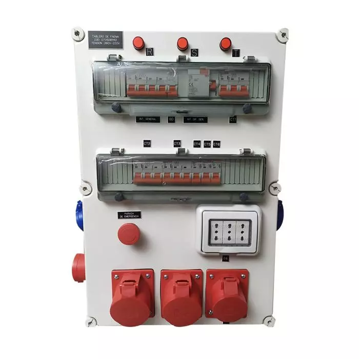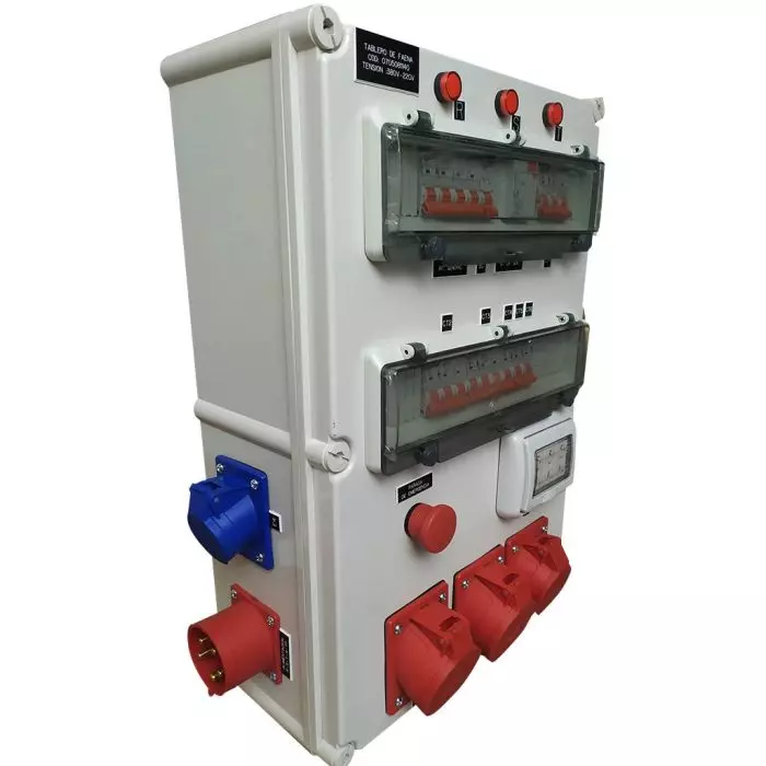 Además de los enchufes, el tablero incluye protecciones eléctricas LS para garantizar la seguridad en caso de sobrecargas o cortocircuitos. Estas protecciones están disponibles en capacidades de 16, 32 y 40 amperios, con una capacidad de ruptura de 10kA.
